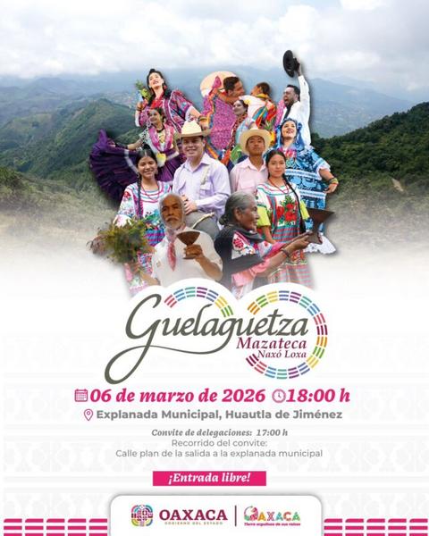 Huautla de Jiménez —La Guelaguetza conocida en la región como Naxó Loxa— convocará a siete delegaciones este viernes 6 de marzo a las 18:00 horas en la explanada municipal, informó el Ayuntamiento de Huautla de Jiménez. El encuentro promete mostrar bailes, cantos y prácticas tradicionales que han sido parte de la vida comunitaria durante generaciones.