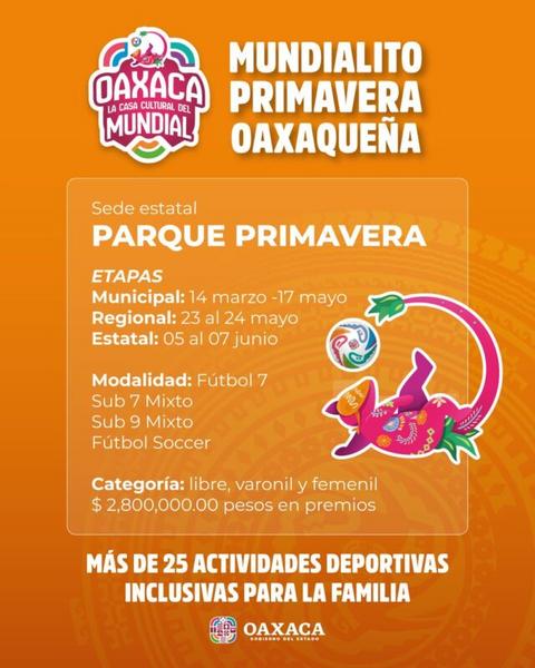 El Gobierno de la Primavera Oaxaqueña anunció esta semana una serie de actividades deportivas enfocadas en el fútbol que se desarrollarán en distintas sedes de la capital y municipios cercanos como parte de la preparación rumbo a la Copa Mundial de Fútbol 2025. Según la información oficial, el programa incluye un mundialito comunitario, talleres formativos, jornadas de activación física y la apertura de canchas para uso gratuito.