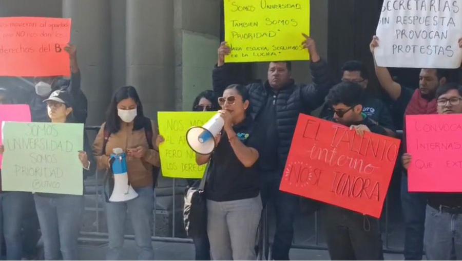 Decenas de empleados —administrativos y académicos— se concentraron frente a las oficinas de recursos humanos para exigir una respuesta oficial. Según el sindicato, la reciente convocatoria para cubrir plazas omitió criterios de antigüedad y priorizó procesos que dejan en incertidumbre a quienes han trabajado años en la universidad.